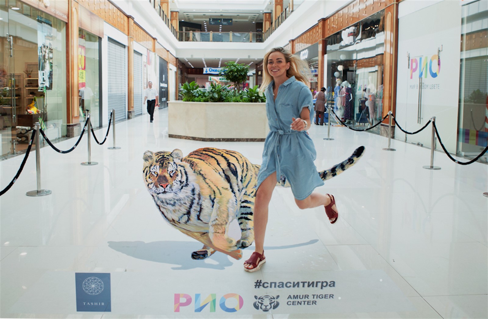С конца июля и весь август под девизом «Спаси тигра» (#спаситигра) в популярных торговых центрах Москвы разместились трехмерные реалистичные рисунки животных, создающие ощущение присутствия хищника среди посетителей. Объемные изображения амурского тигра появятся в ряде столичных торгово-развлекательных центров «РИО» и Avenue South West